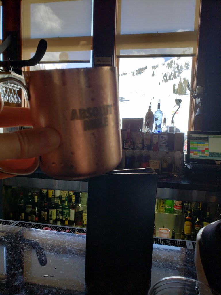 Once relived, I suited up and headed toward the growing line at the bus stop. The bus was packed but everyone seemed to be in good spirits. The line for lift tickets was huge, but the staff worked quickly to get everyone on their way. I took a glance at the insane lift line traffic jam and opted for a pre-ski Moscow Mule.