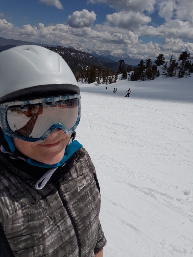 Finally, heading toward Mammoth, the traffic started building and so did the pressure on my coffee-filled bladder! I had to park far from the resort along the road but they run frequent shuttle buses. However, there were no porta-potties near the bus stops so I needed to figure out how to discretely release the grounds. The source became the solution: I lined the empty commuter cup with the plastic bag from the bagel, sat in the passenger seat and let ‘er rip! Or rather, DRIP. Oh well, it was a rental car!