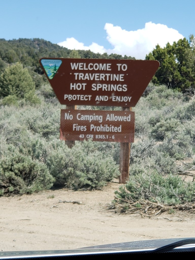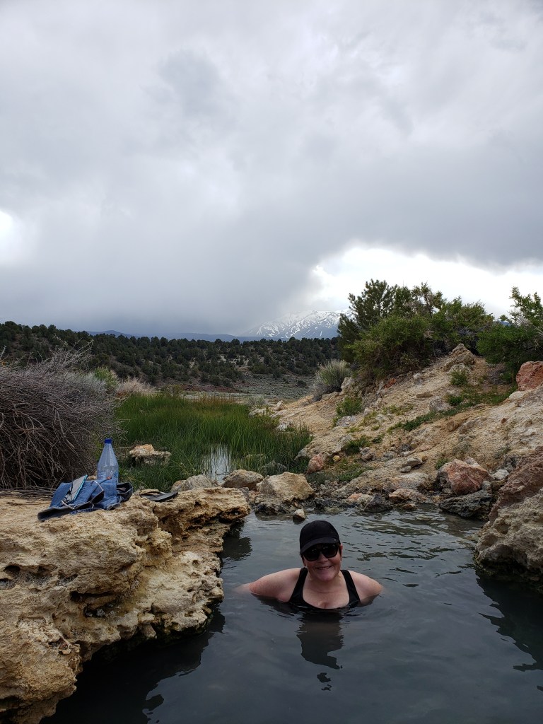 I left mid-afternoon and headed to my next destination: Travertine Hot Springs. The road was not too difficult to FIND but it wasn’t easy to CLIMB. You will want to be in a vehicle with decent ground clearance and AWD. It was more crowded than I thought it would be, although it was a Saturday afternoon of a holiday weekend, so probably worse than usual in terms of user load. What a beautiful place! There are natural pools scattered throughout the area so you have to hike around until you find an unoccupied one. Wear sturdy shoes! I dressed strategically under my ski attire: black sports bra and capri compression pants. I just wore a jacket over it plus hiking boots, and brought a towel in my backpack. I figured, it was close enough to a swimsuit and in a quick-dry fabric. I’ve read that there are often nude bathers there, but I didn’t see any that day.