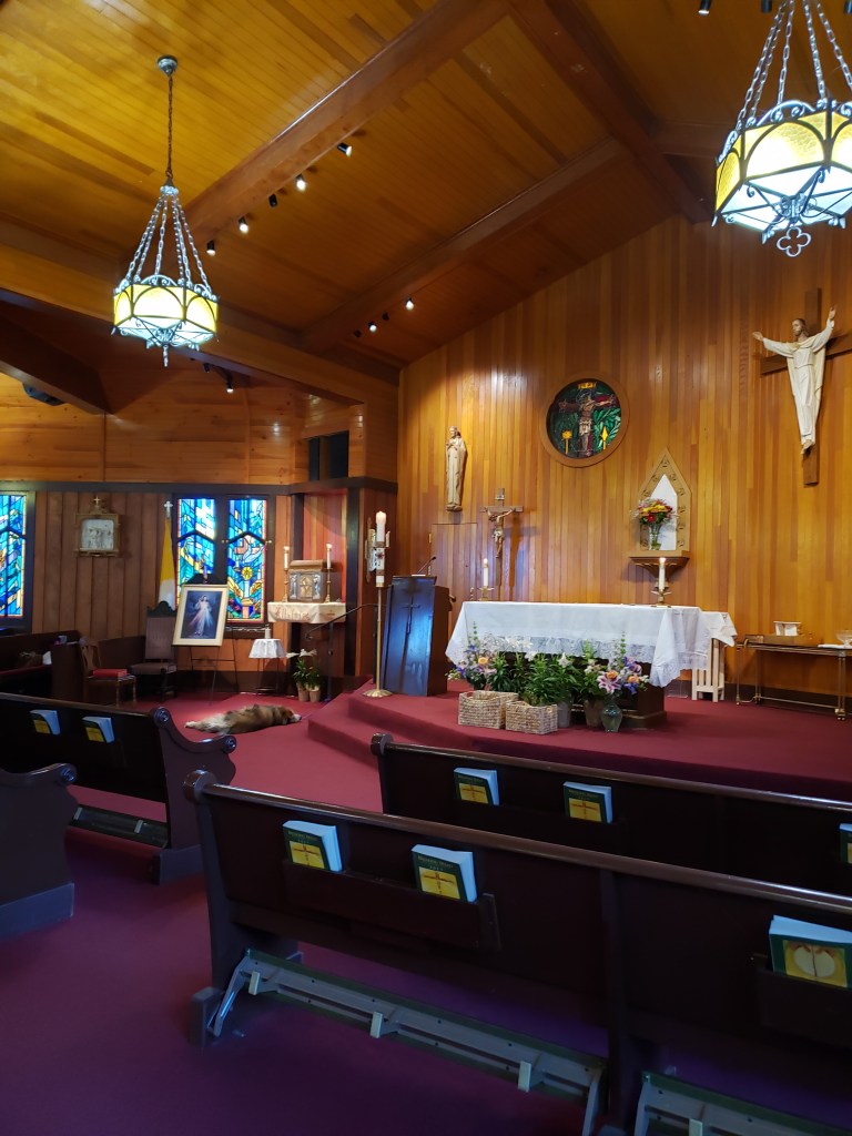 I woke to continuing light snowfall and made my way to 8AM Mass at Corpus Christie Catholic Church in Tahoe City. The priest even had his (very good) dog in church!