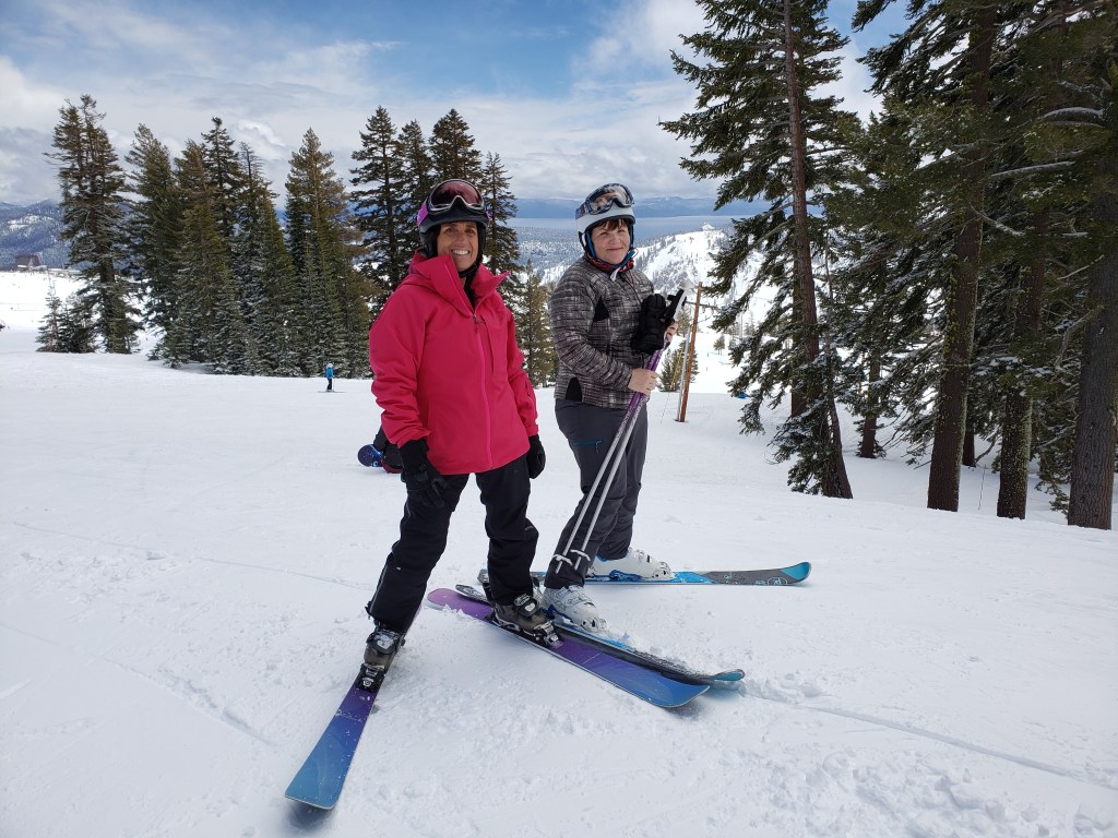 We made a stop in the Gold Coast lodge for a bathroom and beer break. I treated a round of (ubiquitous and reliable in Western ski areas ) Coors Light. We ran into some friends of Cherie and we talked with them for a bit. The woman told us about her great experience with a Squaw Valley woman’s camp that dramatically improved her abilities and confidence. A camp like that is something I hope to have the opportunity to try someday.