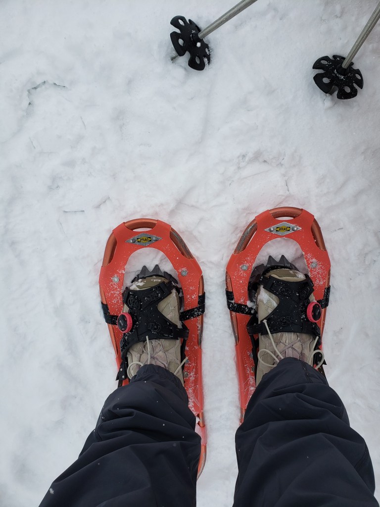 I knew I would likely not be able to get into my room upon arrival, as my flight landed around noon. However, I packed a backpack with cold weather hiking clothes and had it as the first item found after opening my checked bag. The hotel directed me towards the ladies’ room to change, and then valet/bellman took my bags to storage. All set for some snow day fun, I hiked over toward the Nordic Center (I planned this out ahead of time) to rent snowshoes and obtain a special lift pass to get up to an area called McCoy Park that has groomed snowshoe and Nordic ski trails.