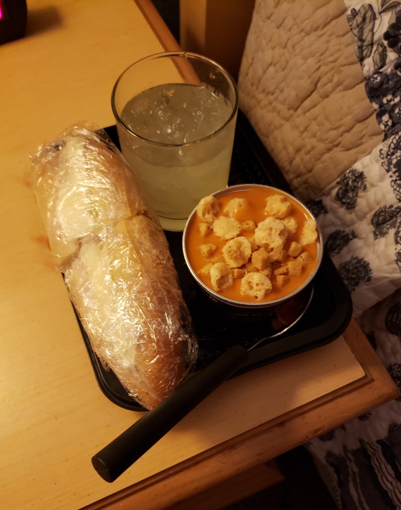 They drove home right from the resort, and I went back to my motel because I had to work for a few hours. I was so wiped out, I was glad my dad left me a sandwich because I was in no shape to get dressed and drag my weary bucket to a restaurant. In fact, I brought a small microwavable cup of soup with me in my luggage. But there was no microwave in the room, so I filled the bathroom sink up with hot water, submerging the soup container. I changed the water 3 times. It wasn’t “hot” per se, but definitely warm and soup-like – good enough for me! This simple meal hit the spot.